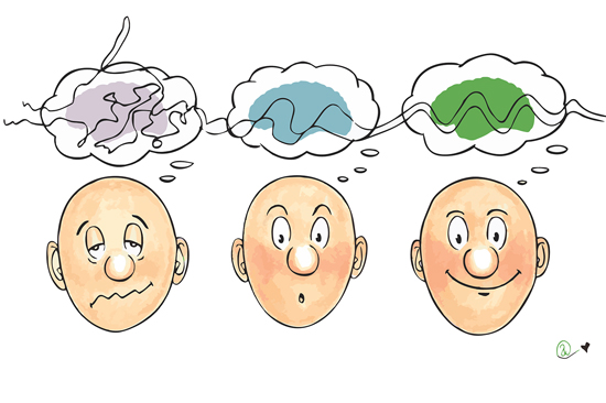 Wenn es in meinem Kopf aussieht, wie beim Kollegen links im Bild, dann setze ich mich hin und zeichne. Nach nur wenigen Minuten setzt die positive Wirkung ein, wie das Beispiel ganz rechts beweist.