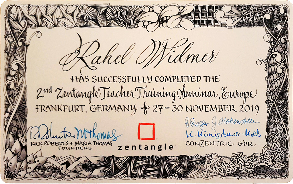 Die Zentangle® Methode* begleitet mich seit 2015. Die Methode ist eine einfach zu erlernende, entspannende und Spass machende Möglichkeit, um mittels strukturierten Mustern wunderschöne Bilder zu zeichnen. Ich bin seit November 2019 zertifizierte Zentangle® Lehrerin (CZT) und freue mich, das Wissen um diese kreativ-entspannende Methode, in meinen Kursen oder Coachings weiterzugeben.